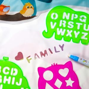 The drawing mat is printedĀ with alphabet letters in eye-catching animal shapes, colorful shapes,number templates and geometric patterns tools.Ā Eventually, it allows kids toĀ learn to write the alphabet through drawing and playing.